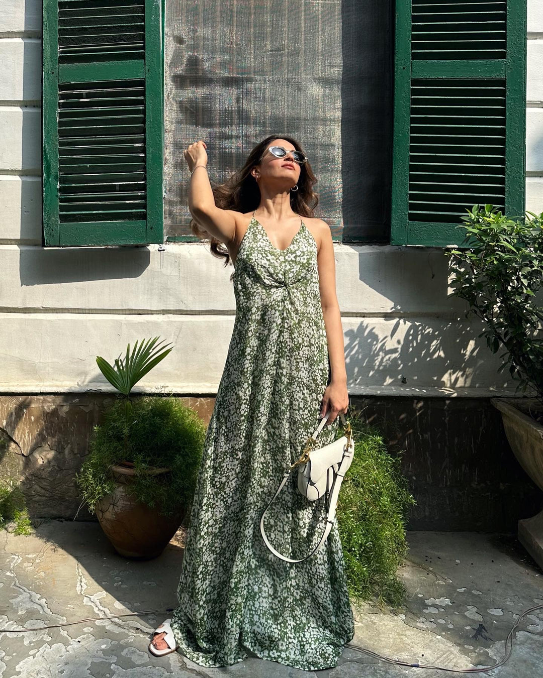 Wearing this stunning midi dress will make you stand out. The muted colors and comfy form, along with rich fabric, make it an excellent statement piece. For a resort-ready style, pair it with a clutch bag and add flowers to your beautifully tied bun.
