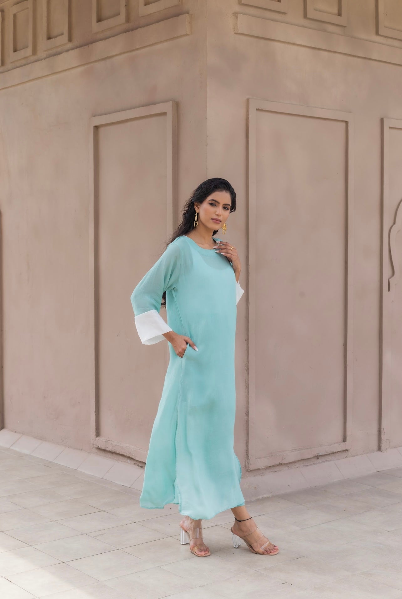 If Greece were an outfit, it would definitely be this once. Clear turquoise waters and white Santorini architecture are brought together seamlessly in this kurta pant set. Adding a global touch to the Indian outfit are the Kimono sleeves that stand out subtly.