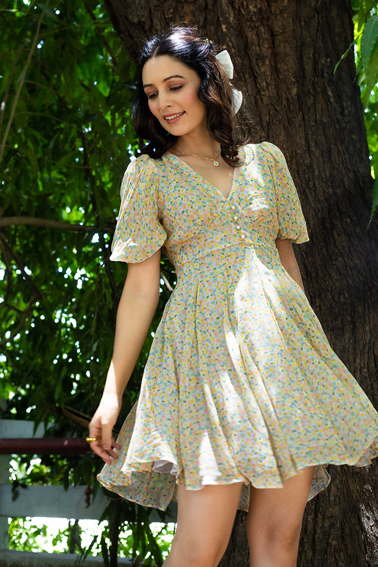 Embrace a playful vibe with our Hana Ditsy Dress. The multicolour ditsy print adds a cheerful touch. The balloon puffed sleeves with pearl button detailing, paired with the triangular flare, exude charm and sophistication.