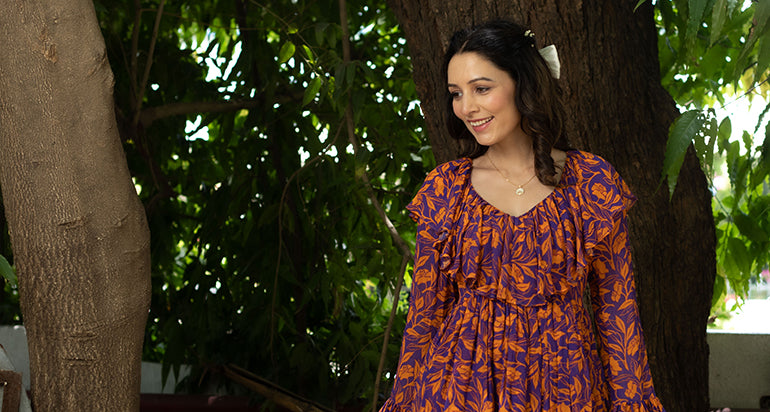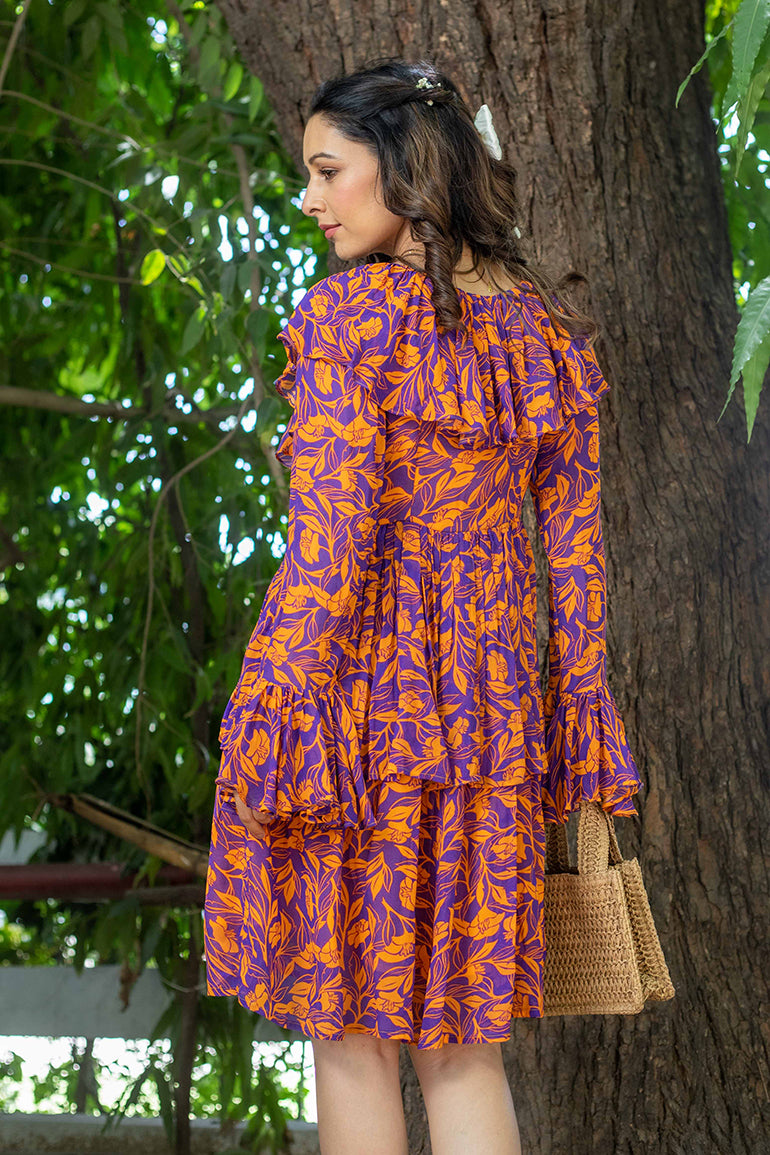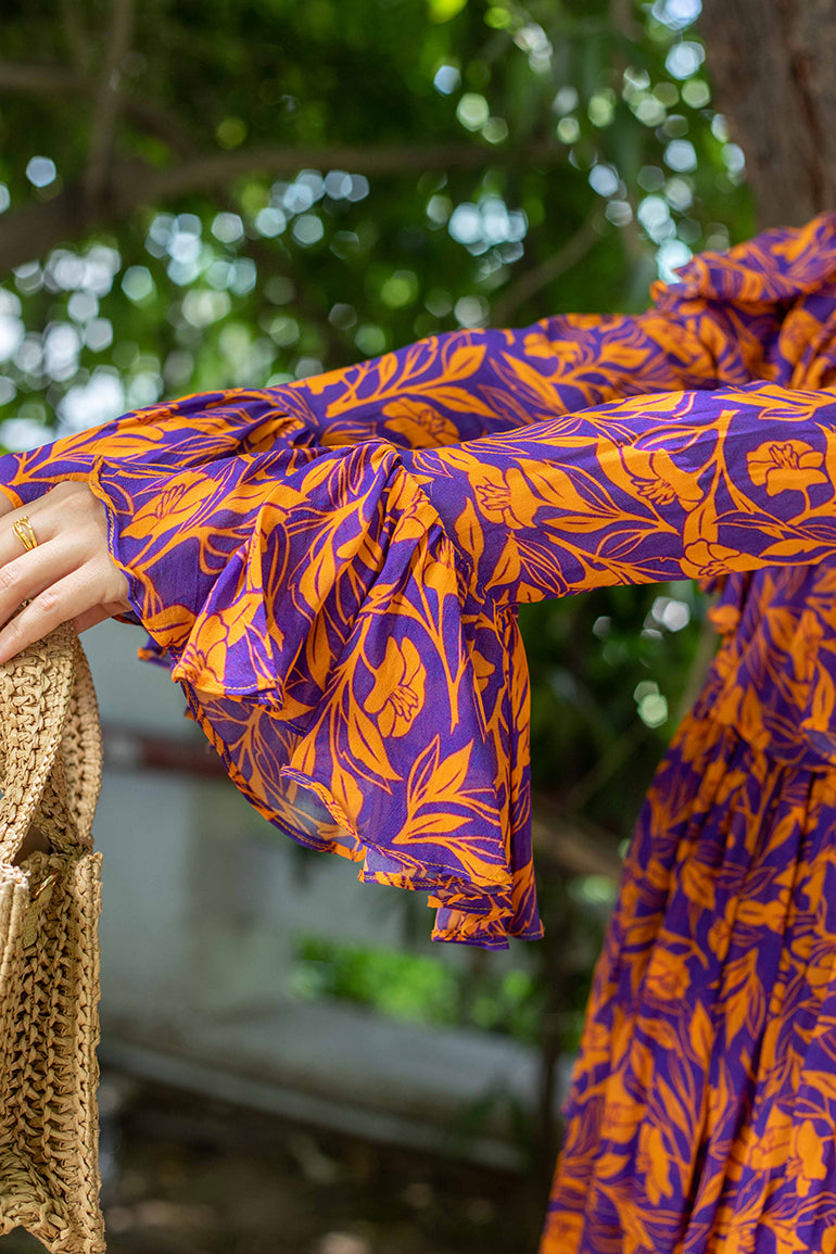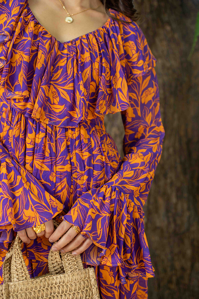 Radiate beauty in our Liana Midi Dress. The vibrant purple and orange floral print catches the eye. The dress features a frill neckline and a double-layered bottom, combining elegance with a touch of flair.