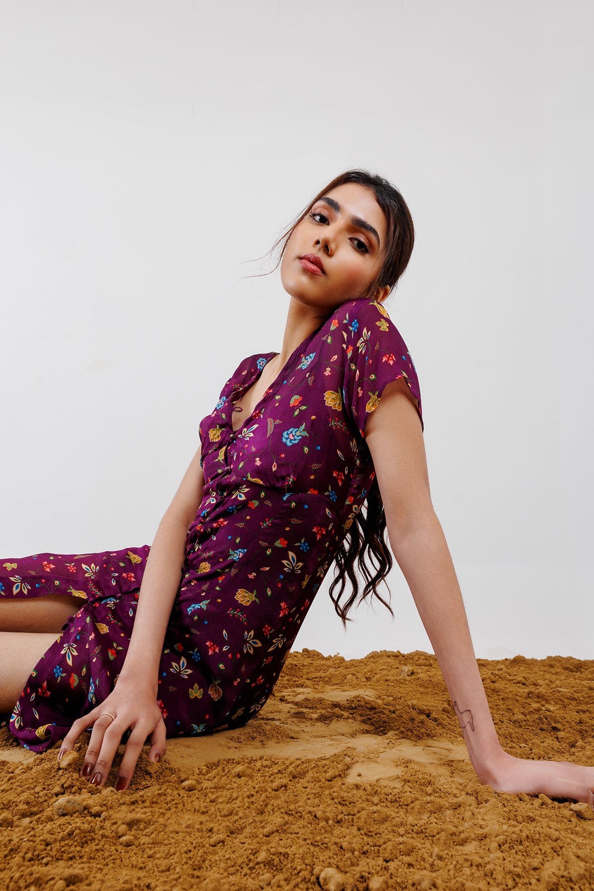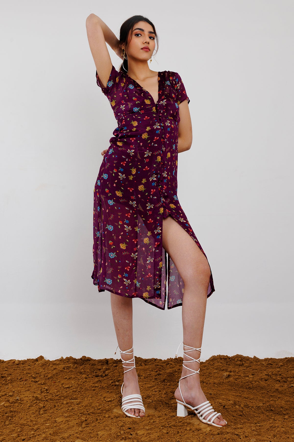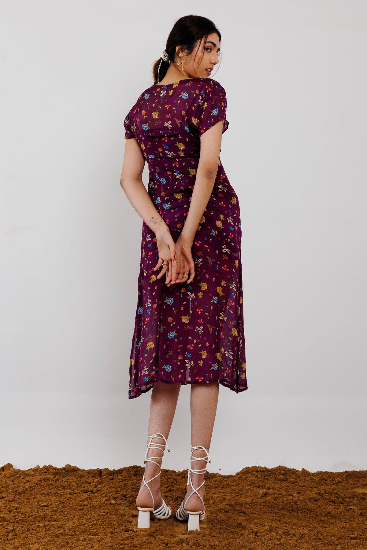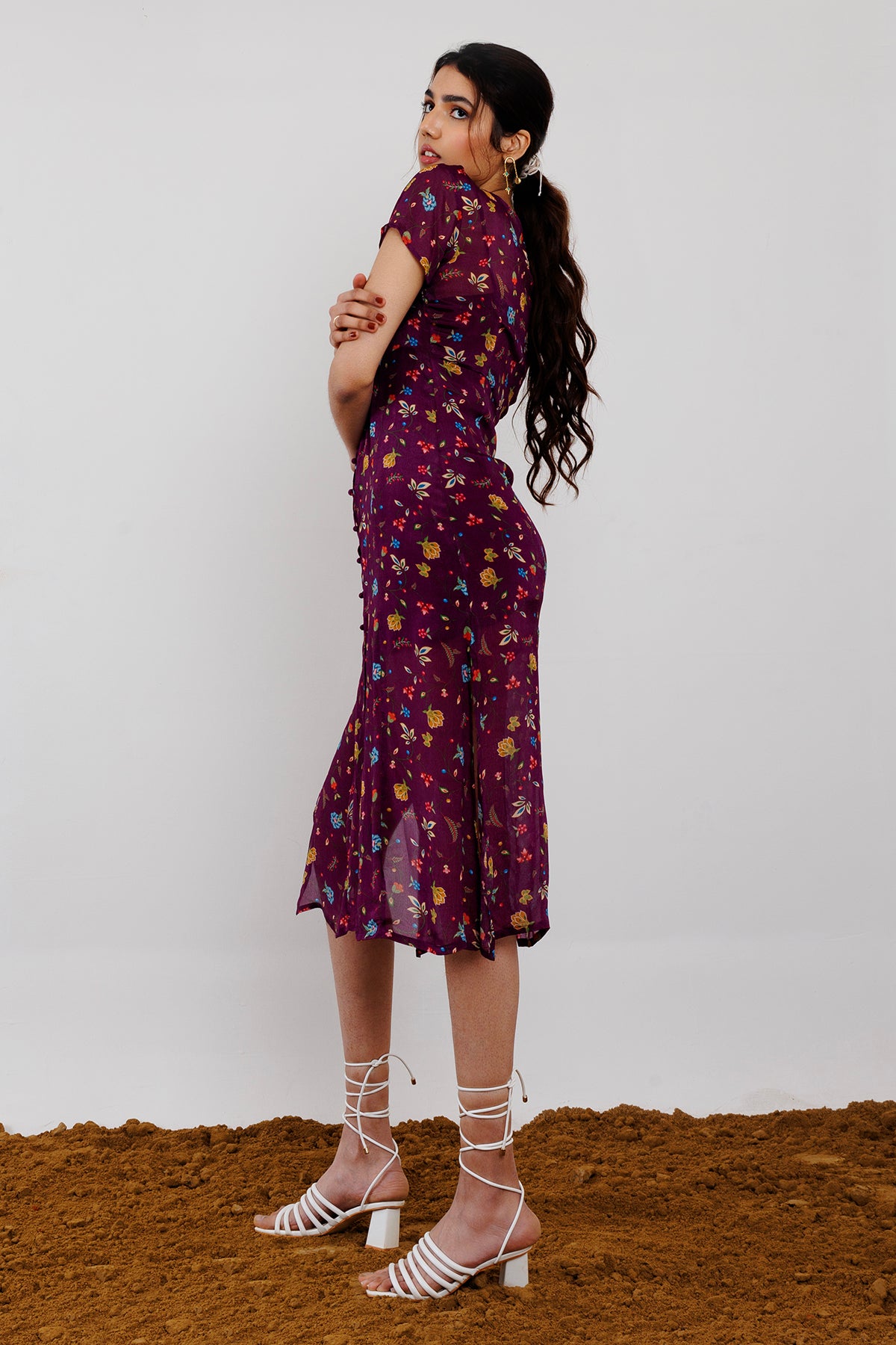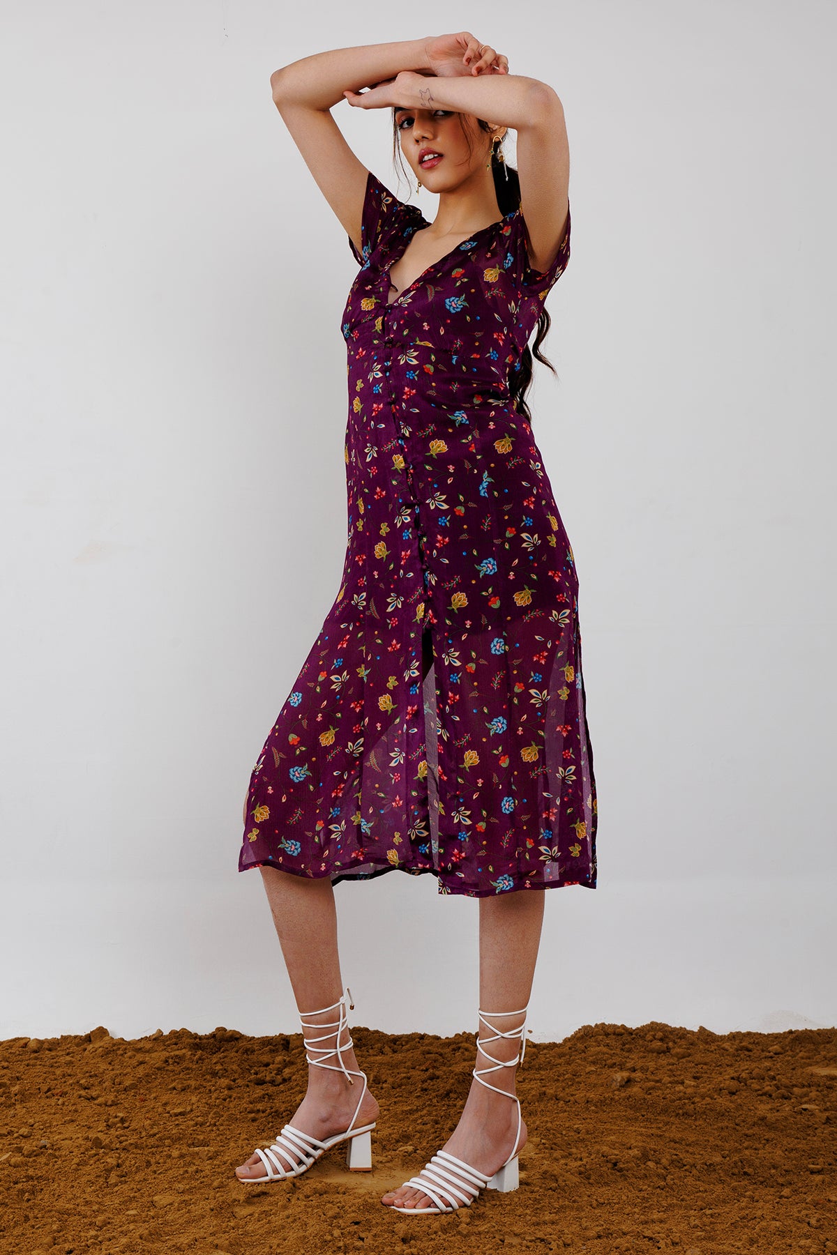Introducing the Olivia Dress – a vision in grape purple, designed to enchant in a flattering midi silhouette. Adorned with a delicate floral print on airy chiffon fabric.