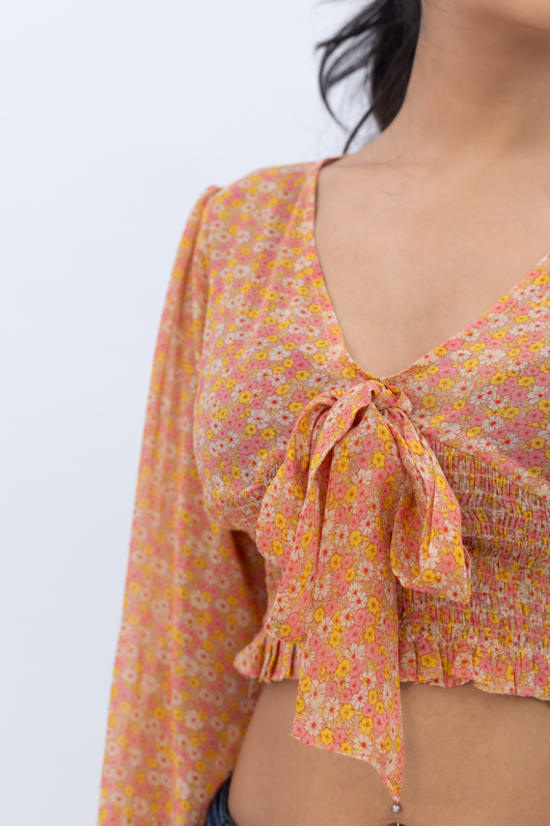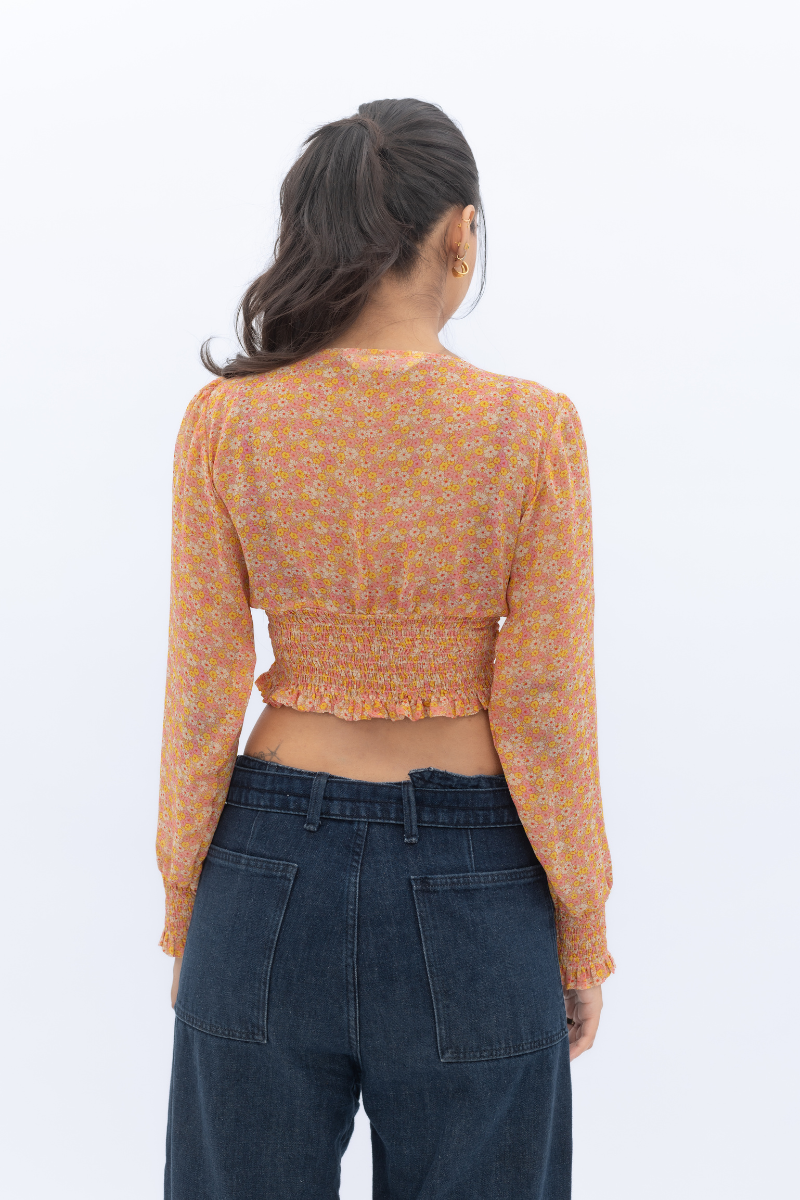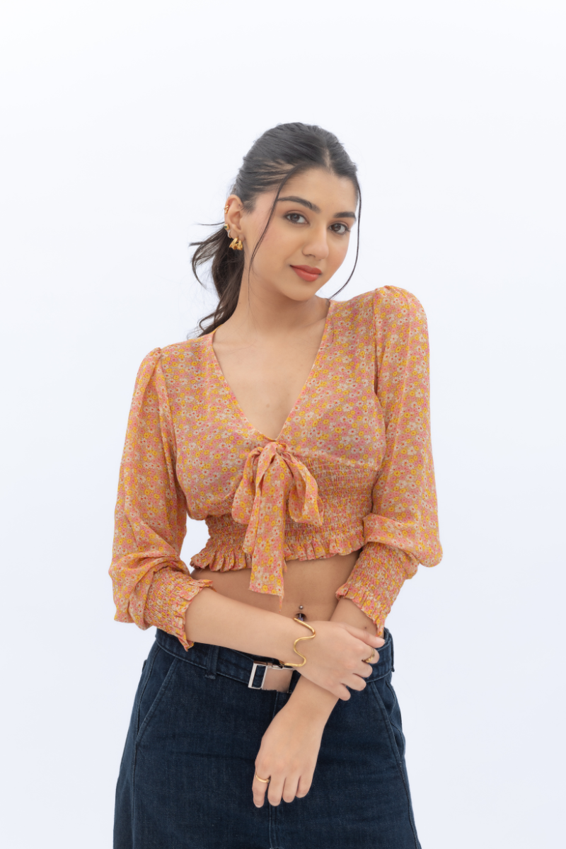 This ditsy floral crop top brings sunshine in every stitch. With a smocked waist, tie-up neckline, and lettuce hem, it’s as flattering as it is fun. Perfect for throwing over high-waisted jeans or summer skirts.