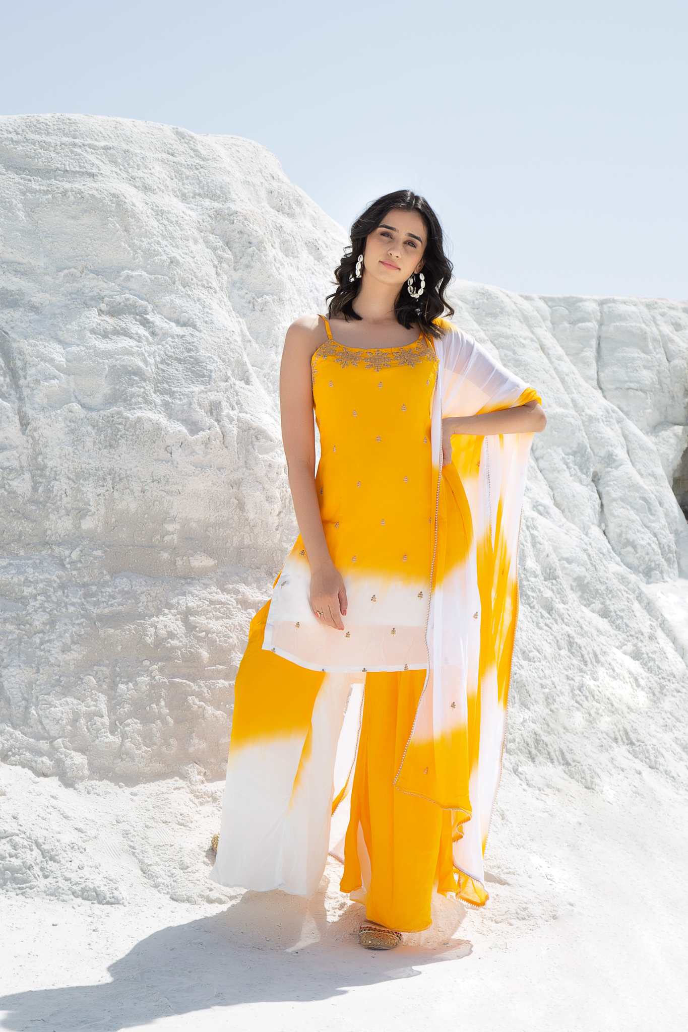 Saffron kurta set in crepe with an embroidered neckline, paired with a matching chiffon dupatta.