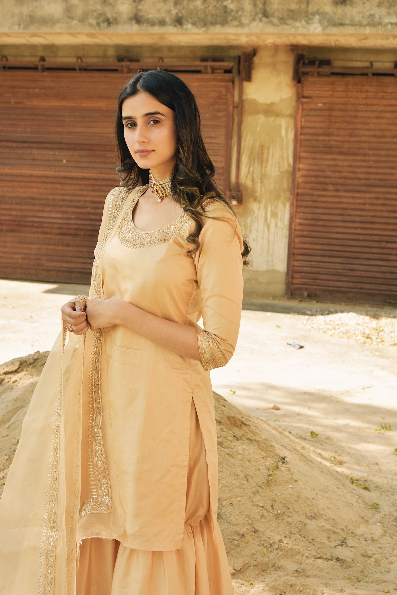 Champagne gold sharara suit set in silk with gotta patti work and an organza dupatta.