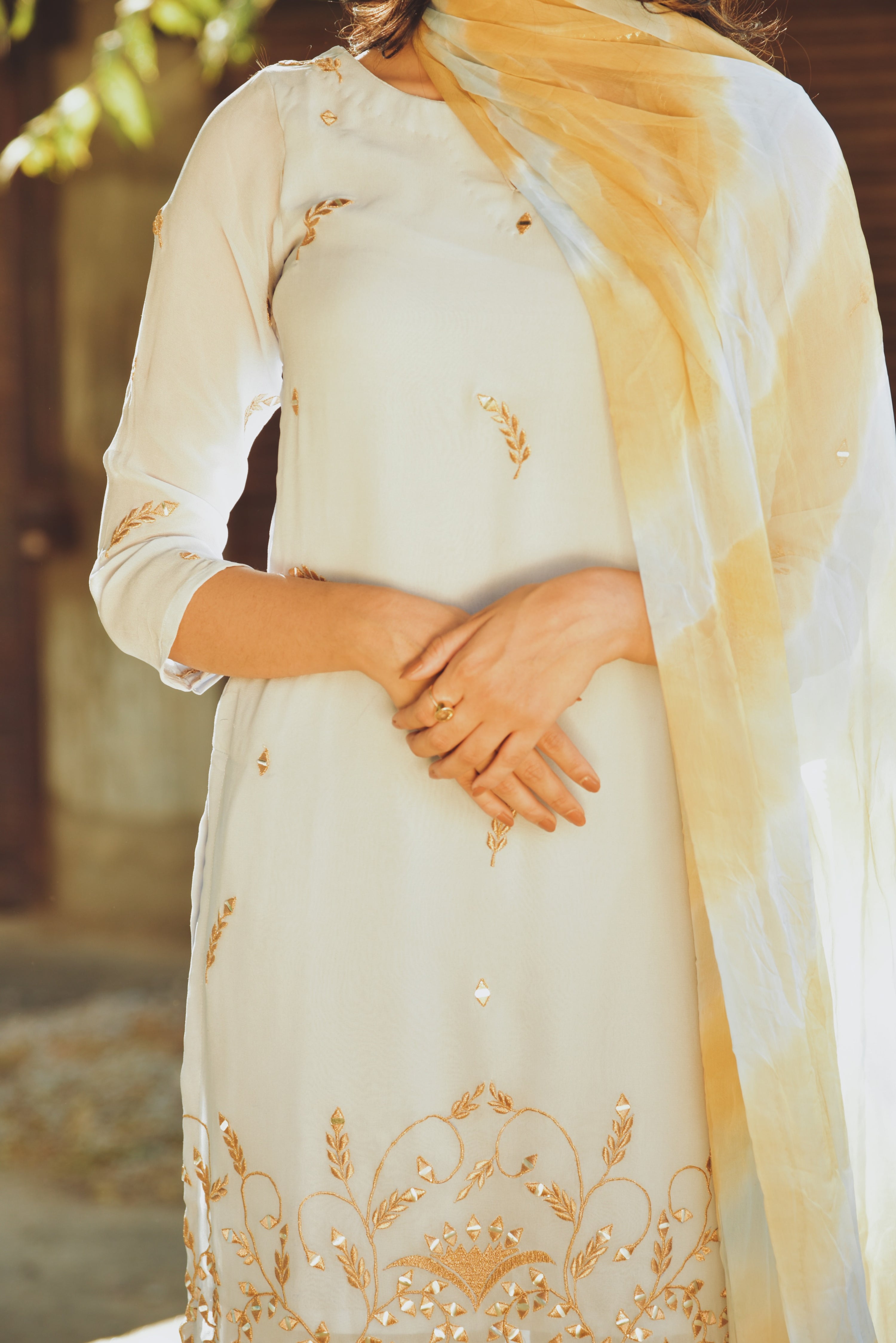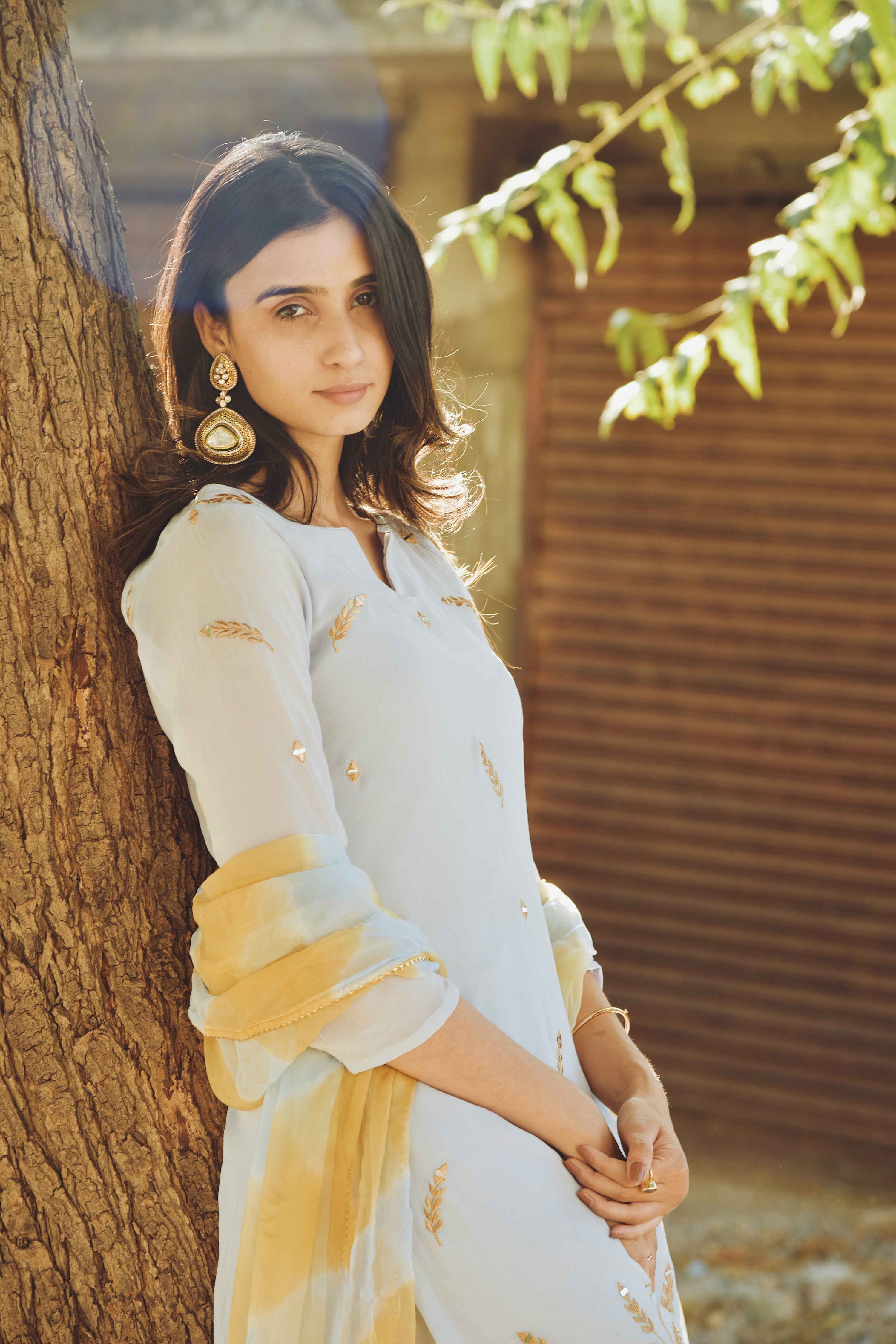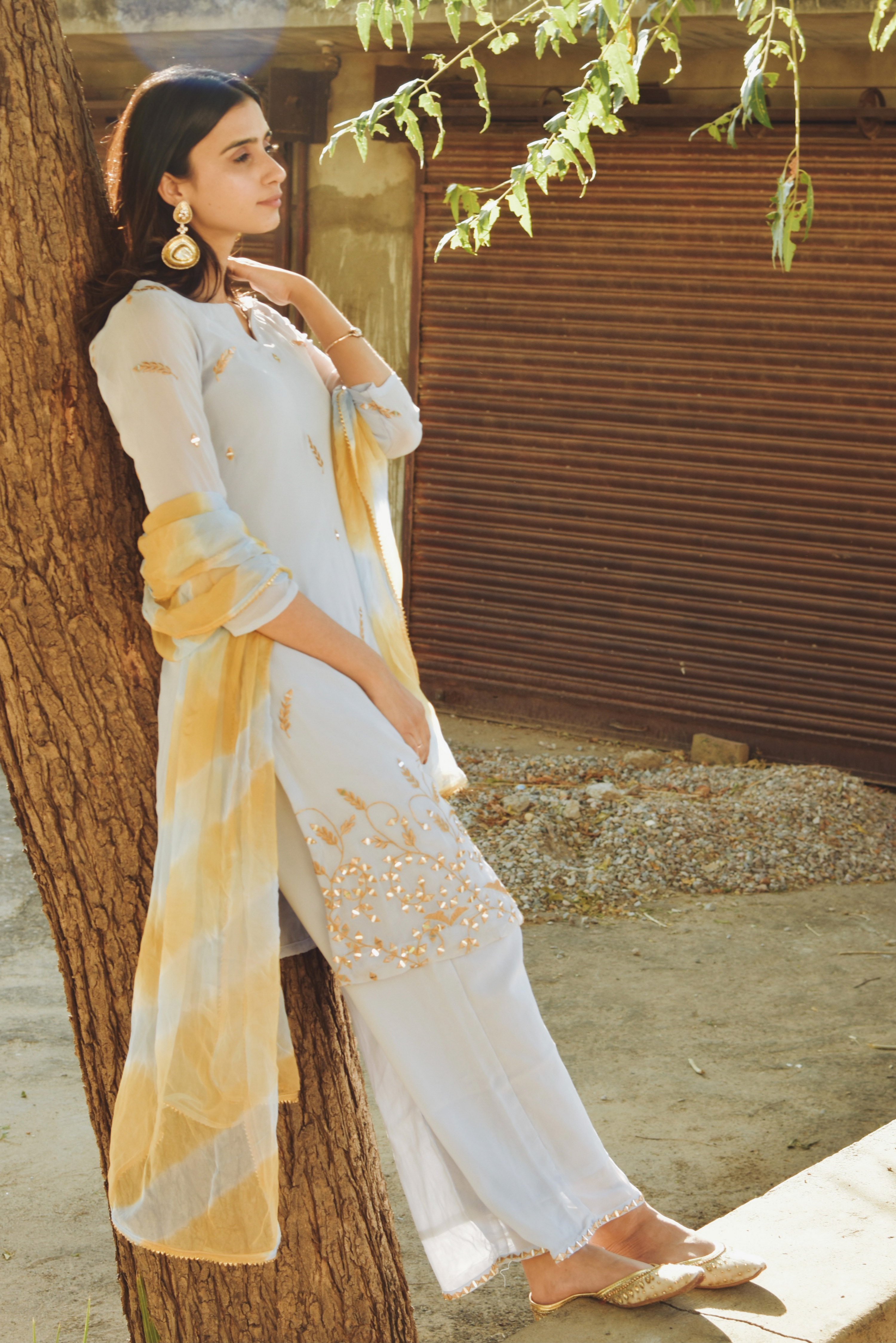 Pale blue suit set in georgette with copper thread work, paired with an orange and blue chiffon dupatta.