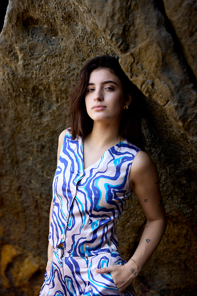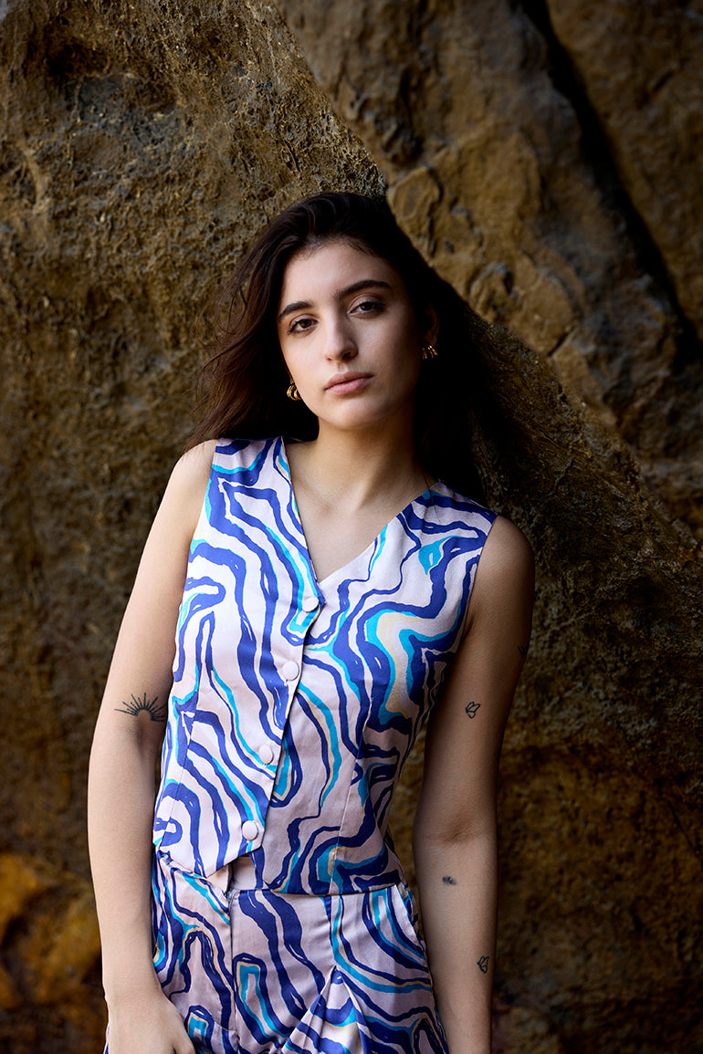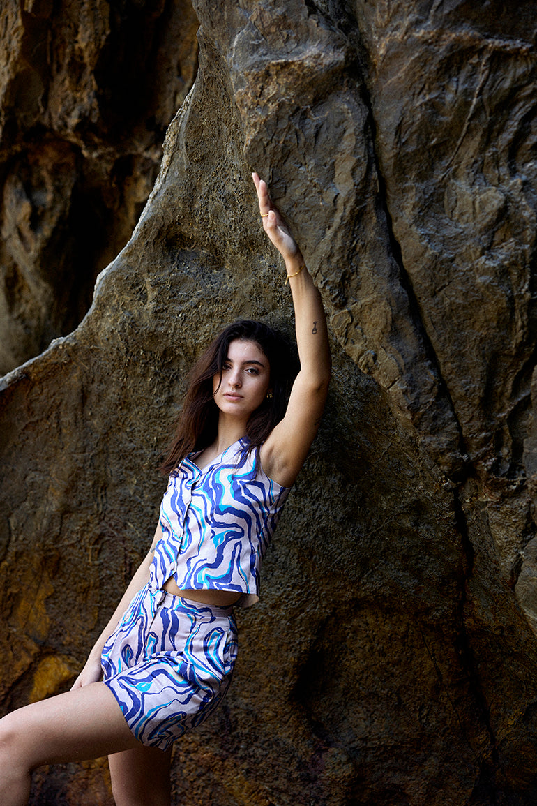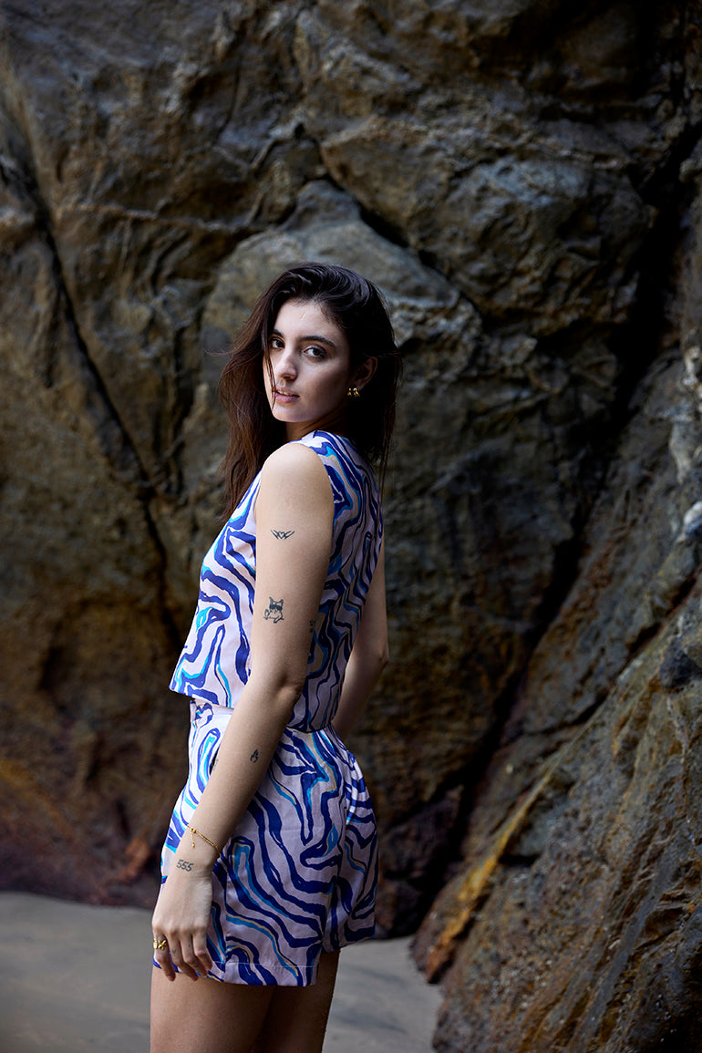 The vest coat features sleek, tailored lines for a polished look, while the satin shorts add a touch of luxury with their smooth, lustrous fabric.