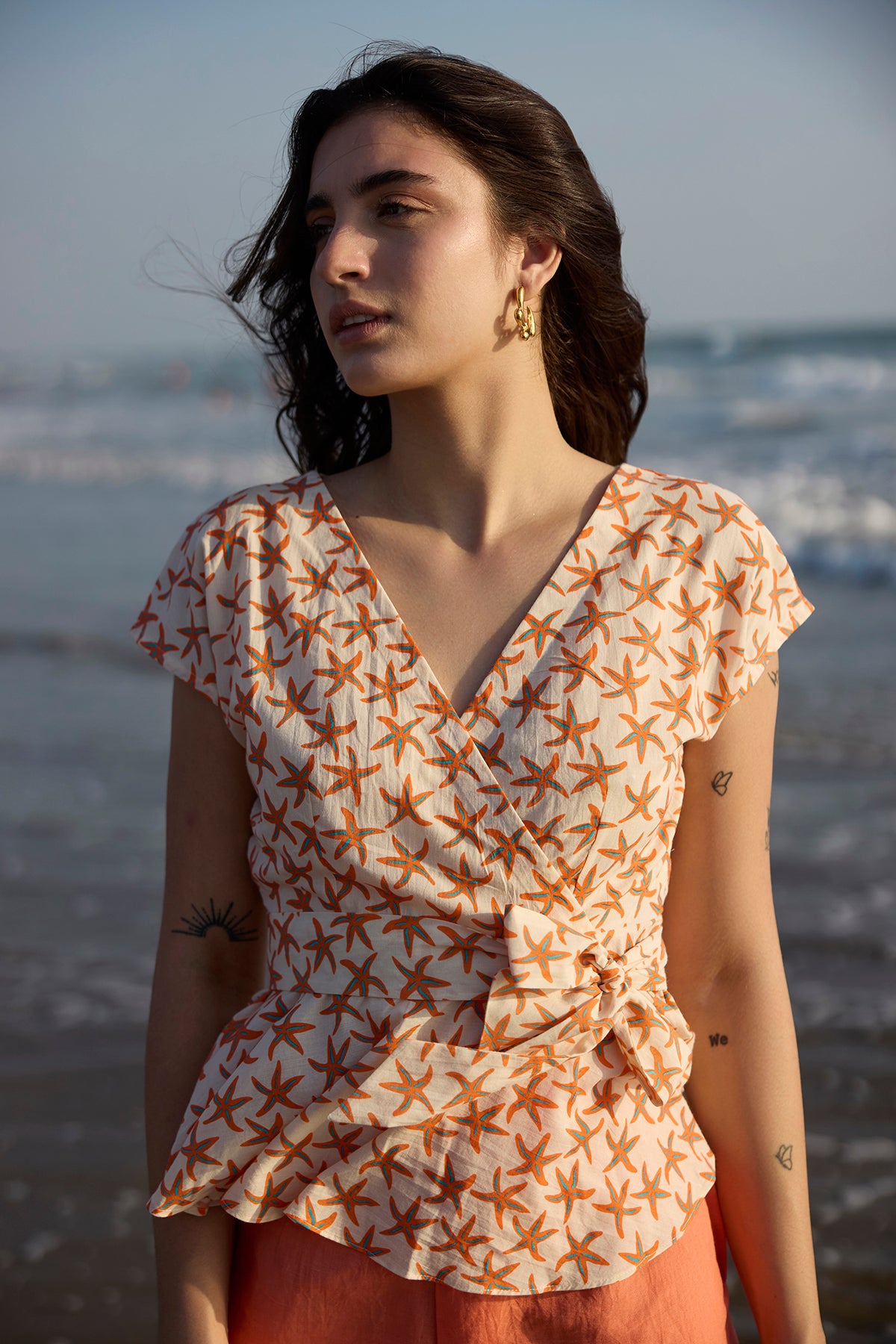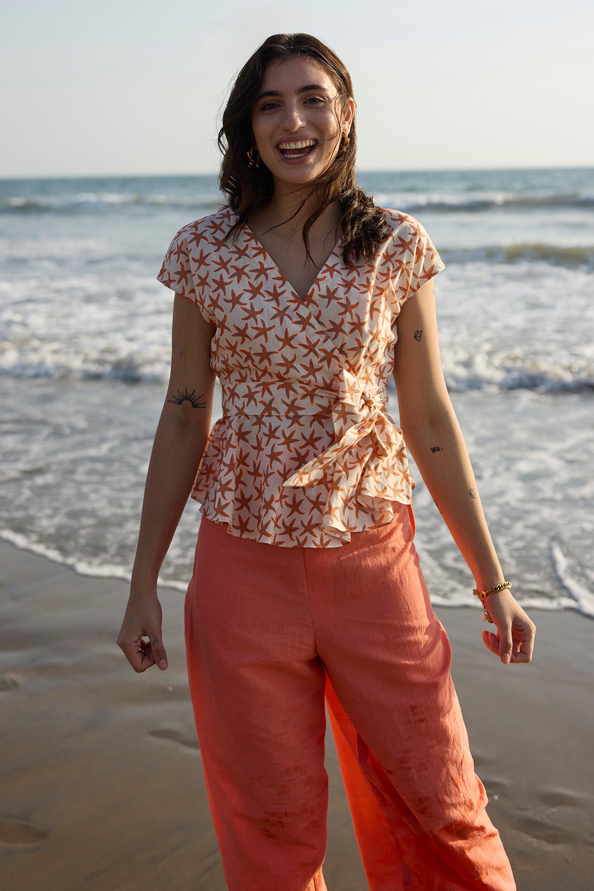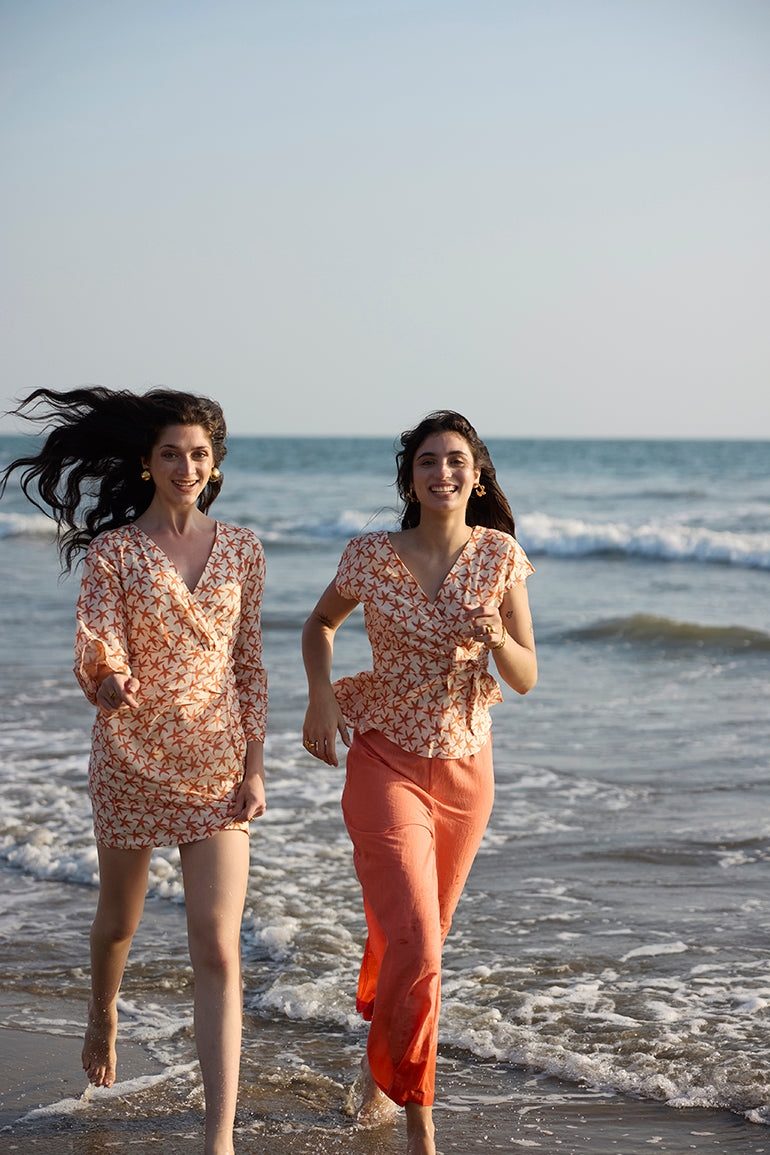 Introducing our Chloe Co-ord Set in off-white base and vibrant orange pants. The cute top features a tie-up belt detail for added flair, perfectly paired with breezy pastel orange linen pants for a relaxed fit.