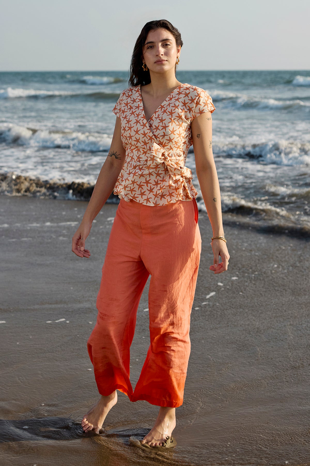 Cotton top and linen pants.