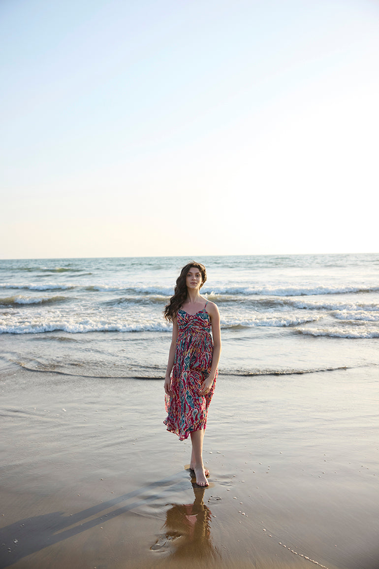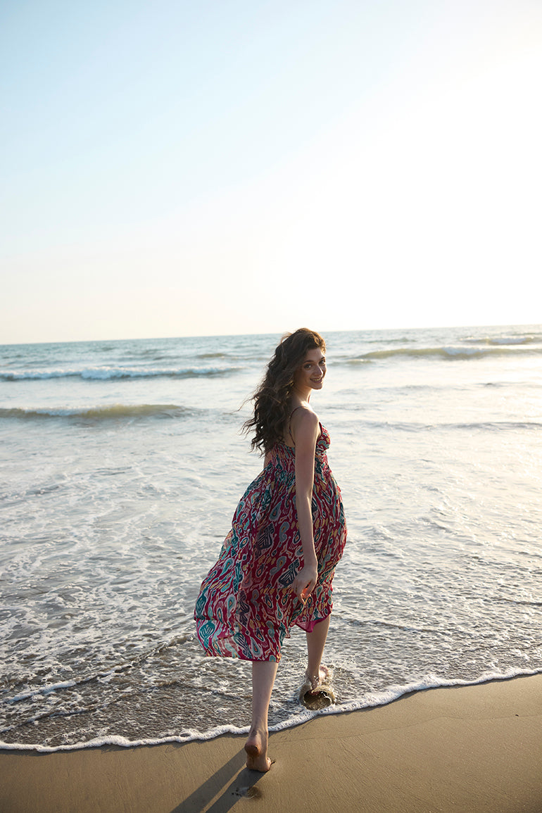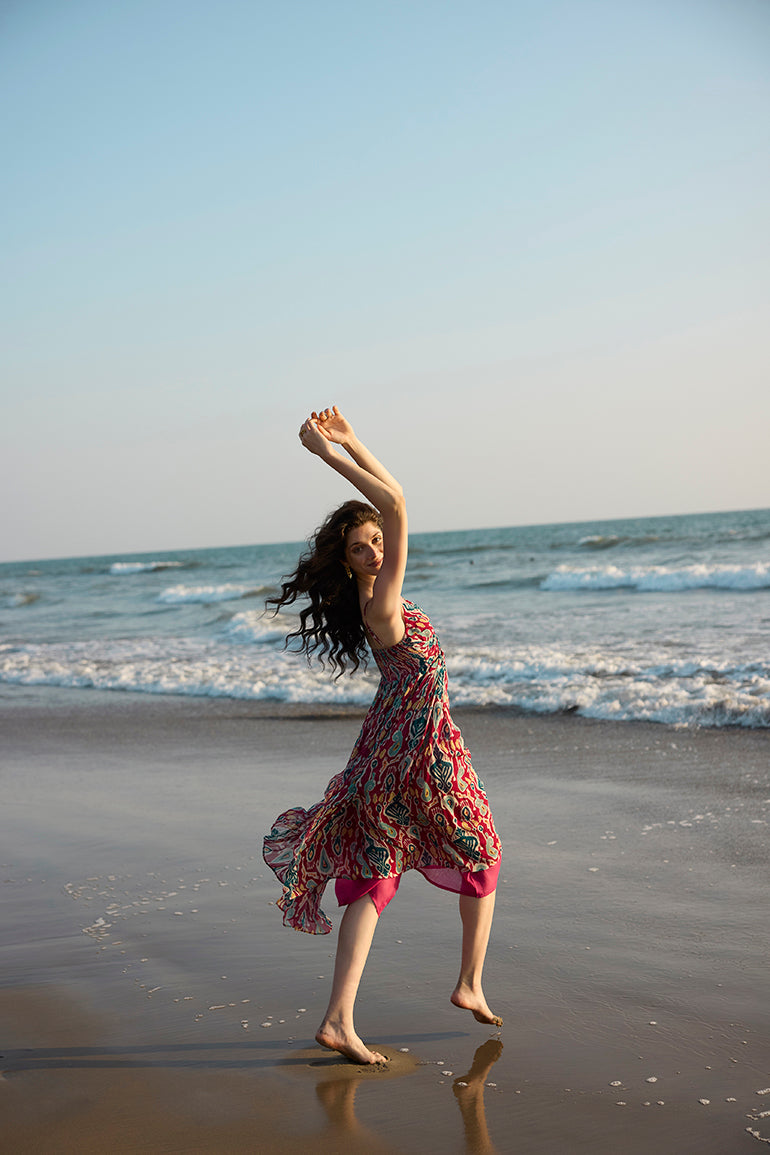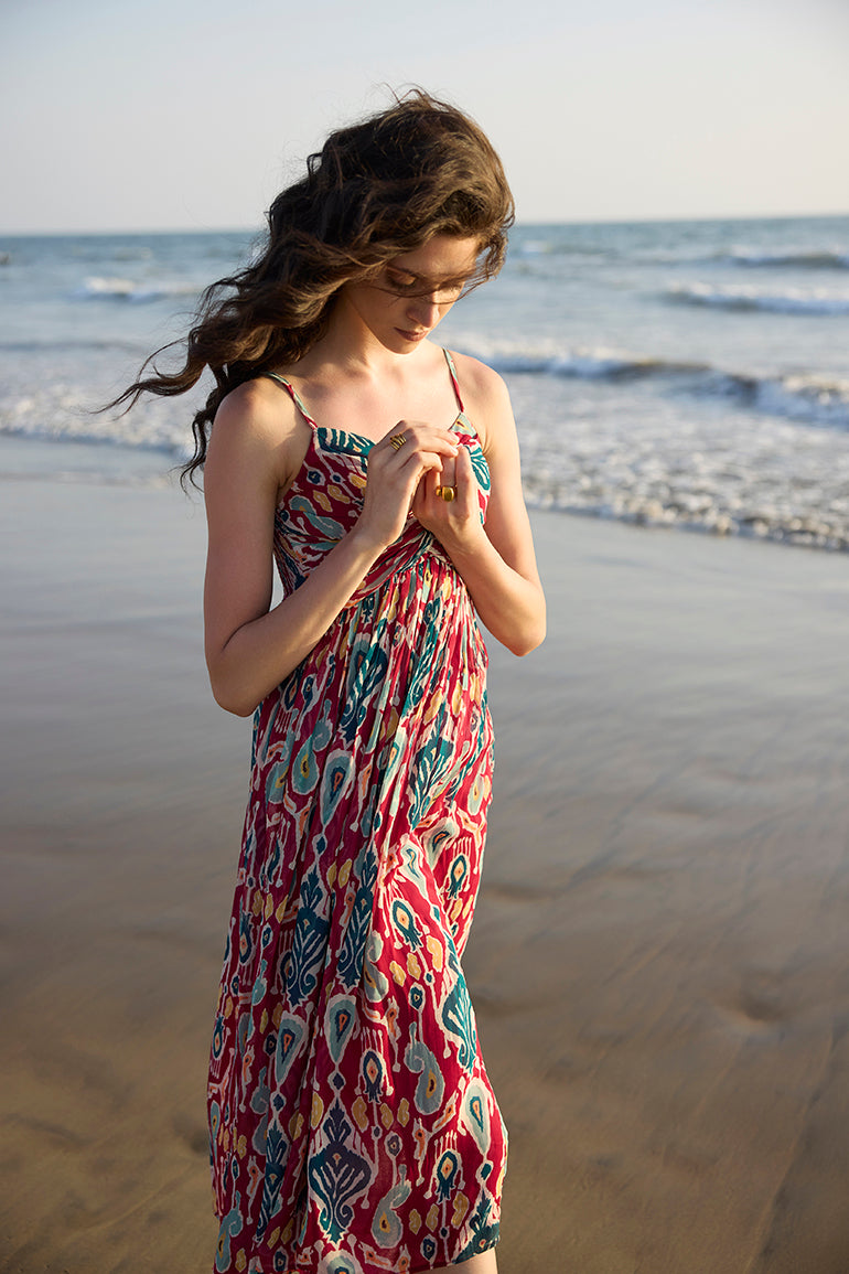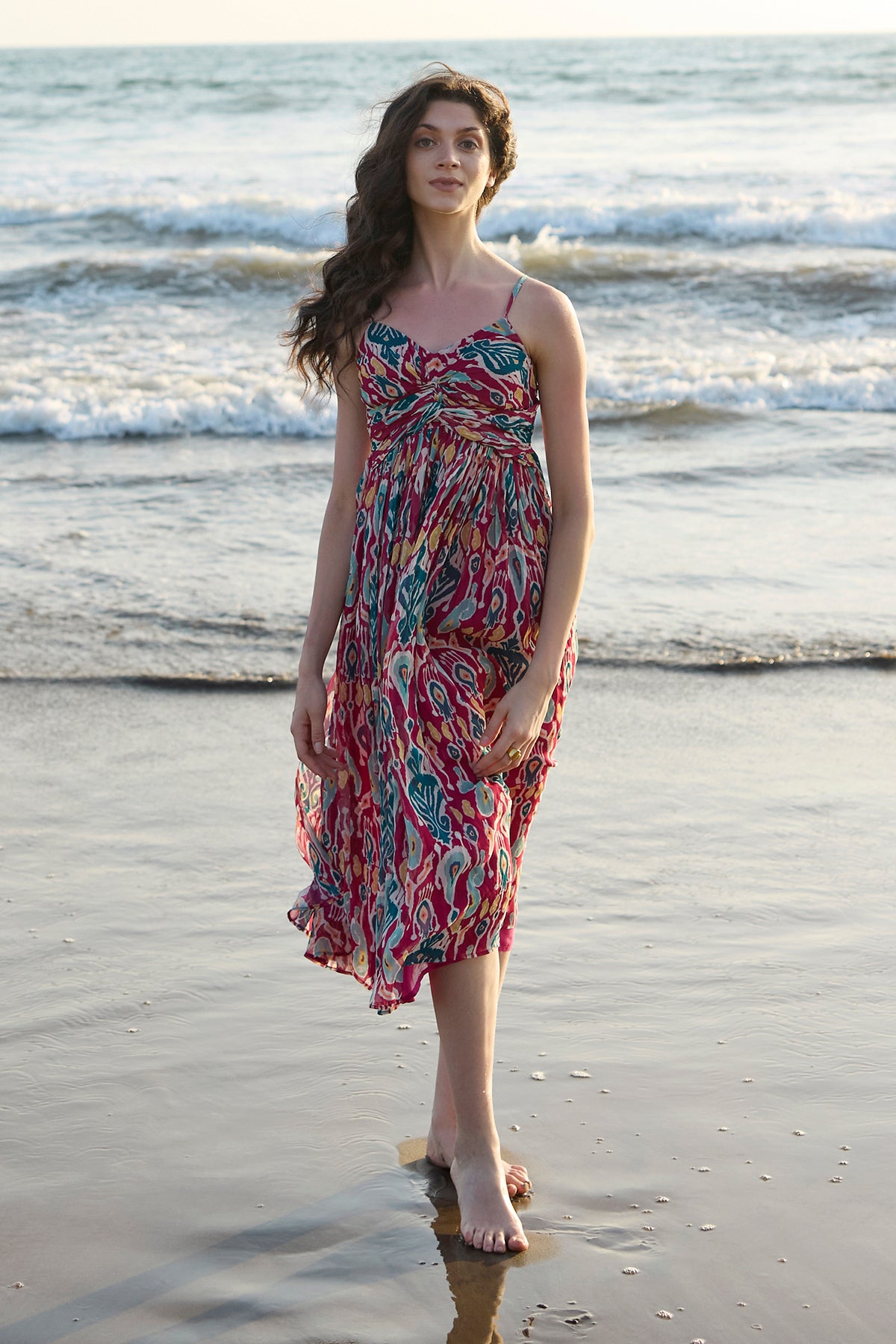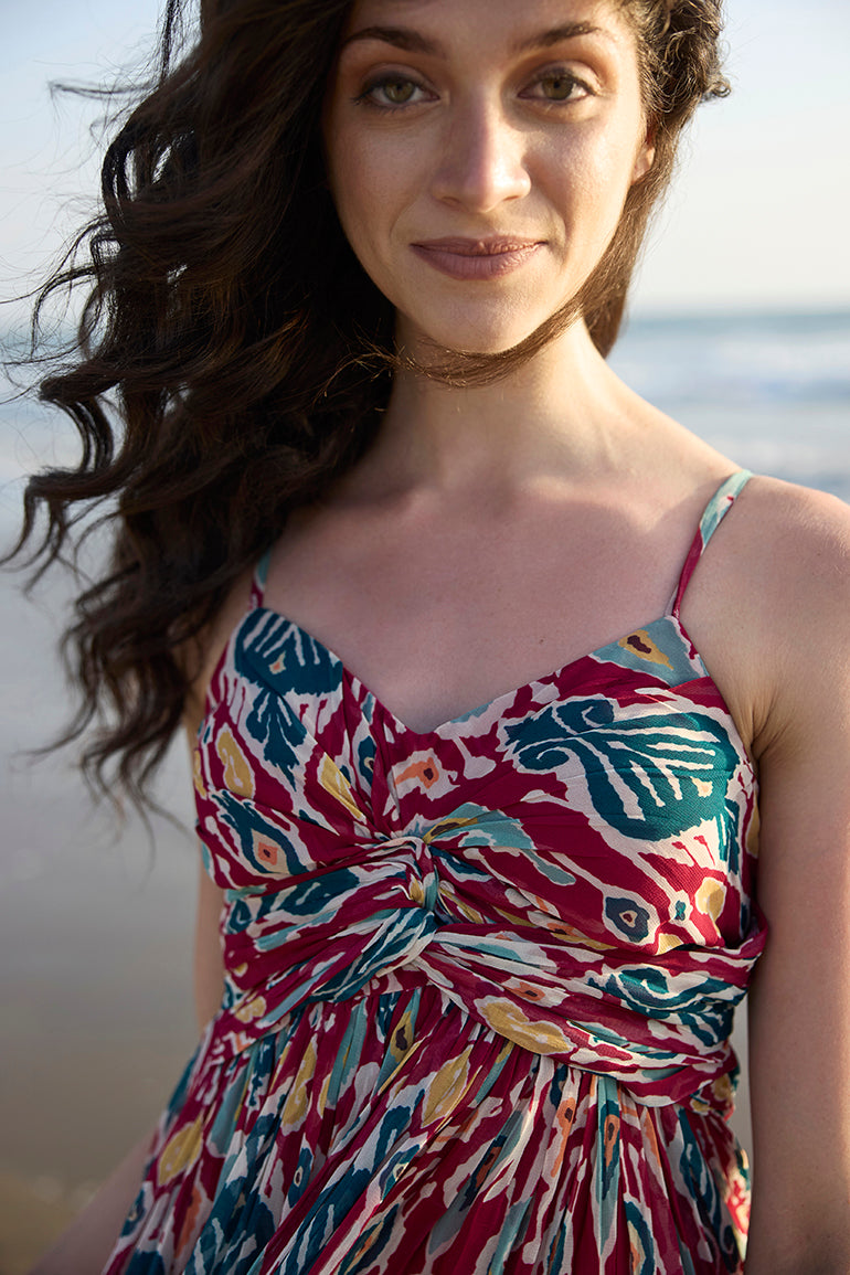 Introducing our Kai Midi Dress In a majestic shade of magenta pink. Adorned with a mesmerizing Ikat print, this dress captures the essence of bohemian charm. The cross-knot detailing in the front adds a contemporary twist, accentuating your curves.