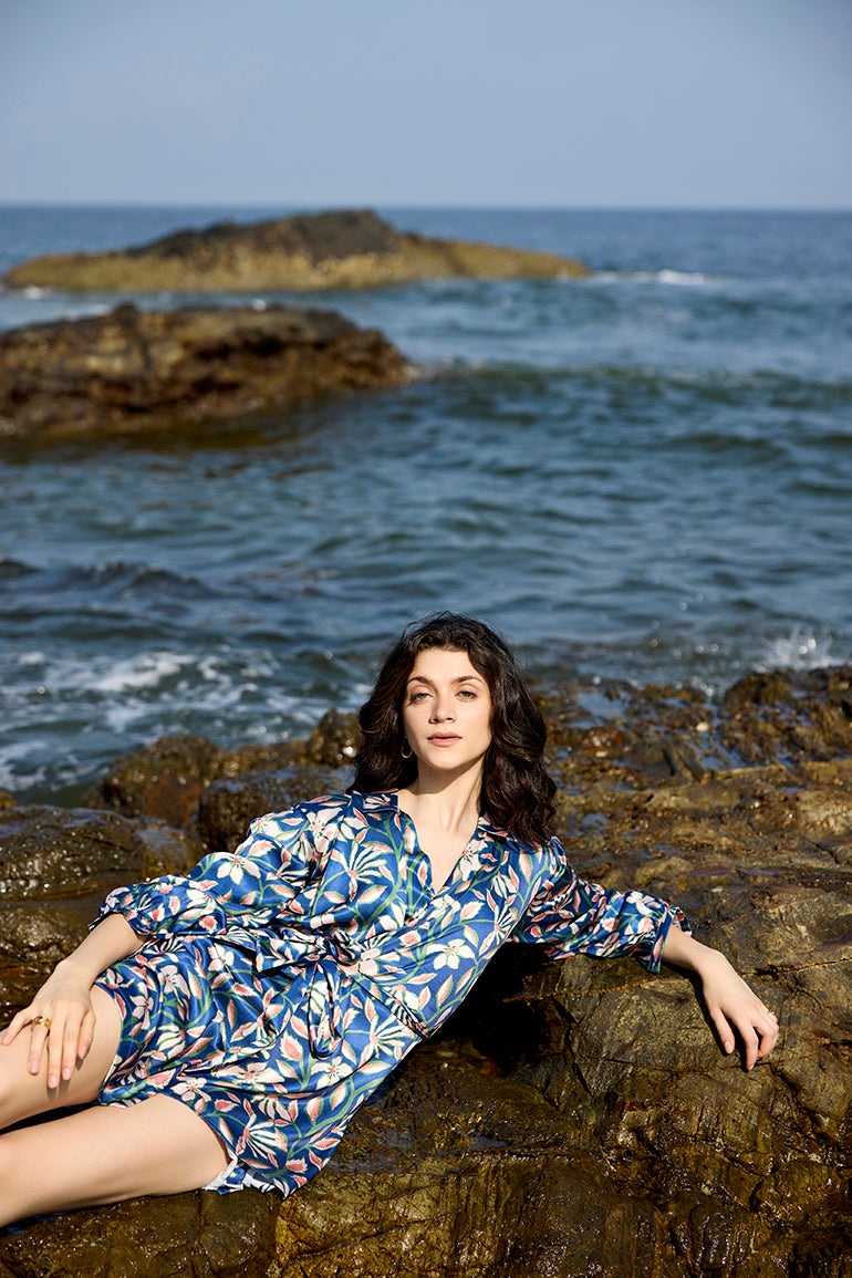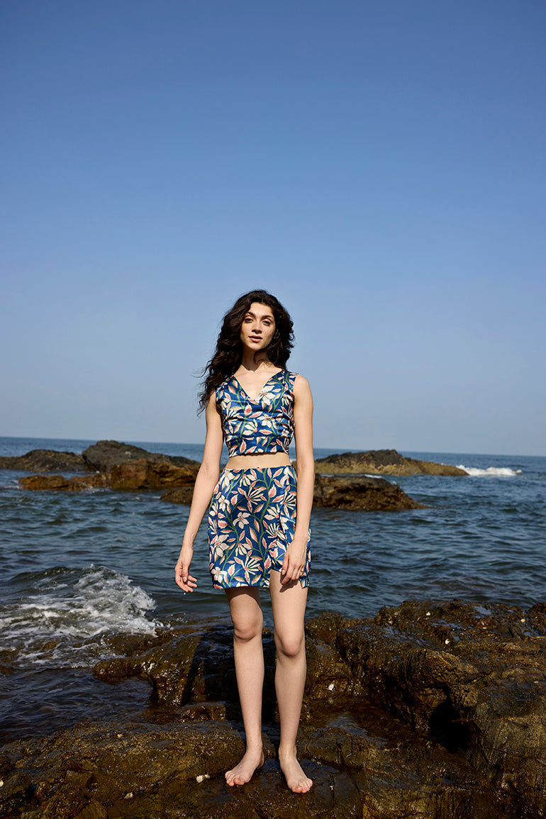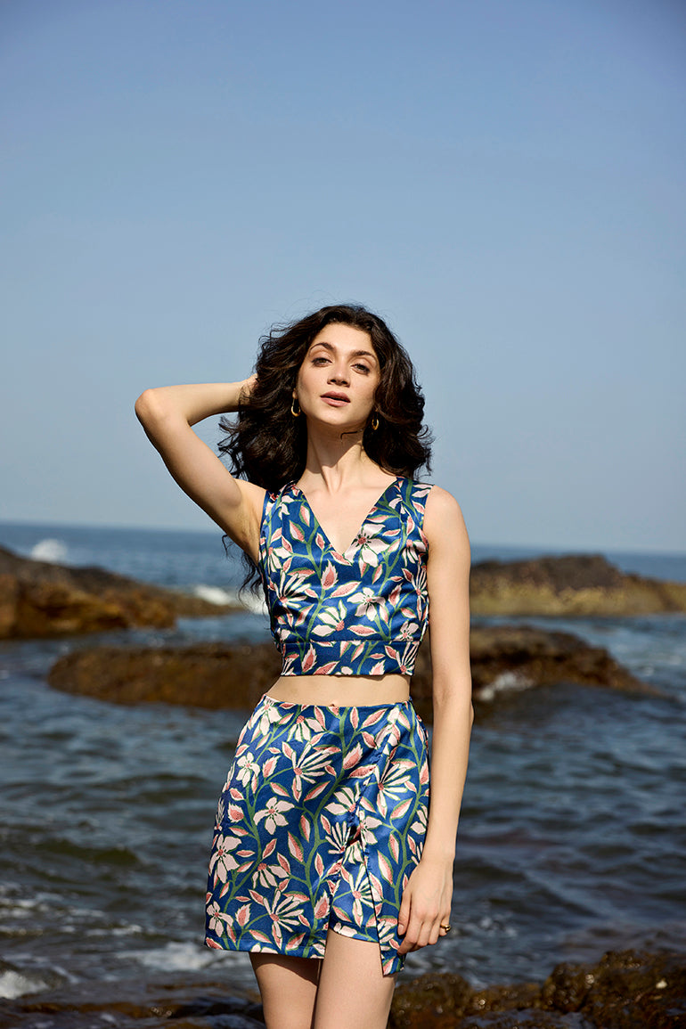 Introducing our Zoe 3-Piece Co-ord Set with Kimono, The set features a pleated crop top with a buttoned back and tie-up detailing, paired with a chic skort. The ensemble is completed with a flowing kimono, all in a sophisticated midnight blue adorned with green and orange prints.