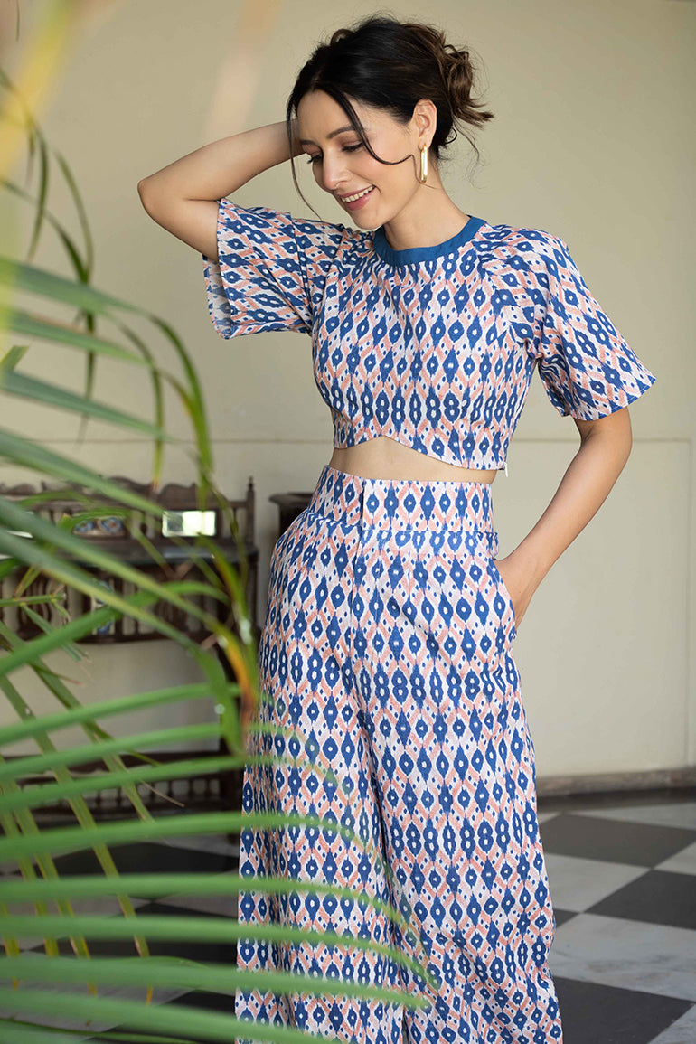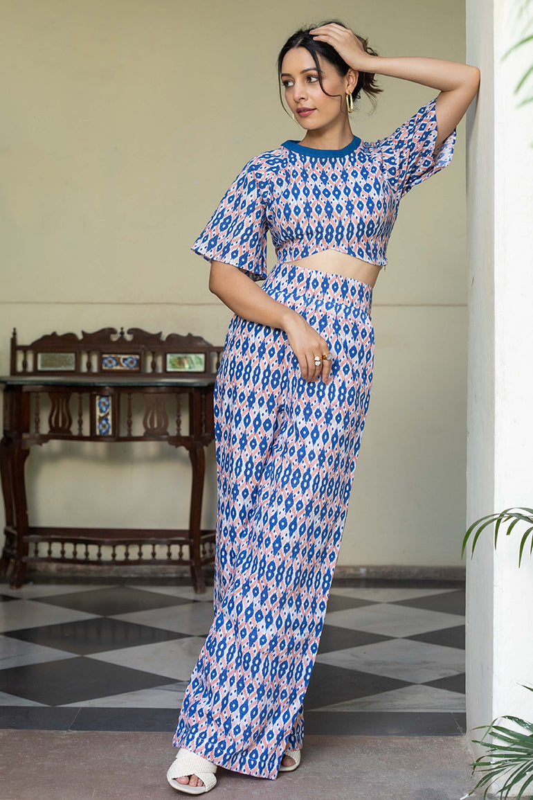 The Shanon Co-ord Set is perfect for those seeking style, comfort, and elegance. Crafted from breathable linen fabric, it features an Ikat Print Top with a high neck, A-line flare, and V-detail hemline. The beautiful combination of blue and cherry maroon colors adds a vibrant touch to any look.